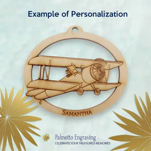 Expertly engraved in our South Carolina studio, this aviation ornament features fine detailing that brings the vintage charm of biplanes to life. Whether displayed on a Christmas tree or gifted for a special occasion, it serves as a lasting tribute to the passion for flying.