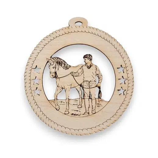 Immerse yourself in the holiday spirit with our Boy Walking a Horse Ornament, a celebration of the enduring bond between equestrians and their noble companions. This meticulously handcrafted ornament from natural wood beautifully captures a serene moment of friendship, making it a standout among equestrian Christmas decorations.