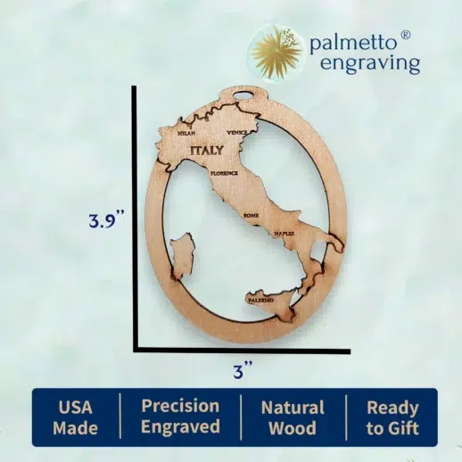 Capture the charm and culture of Italy with this beautifully crafted wooden ornament. Whether you have Italian roots, love to travel, or admire the country’s rich history, this ornament is a perfect way to celebrate your connection to Italy. Its finely engraved design showcases the shape of Italy, making it a wonderful addition to your Christmas tree or a heartfelt gift for someone who cherishes Italian heritage.