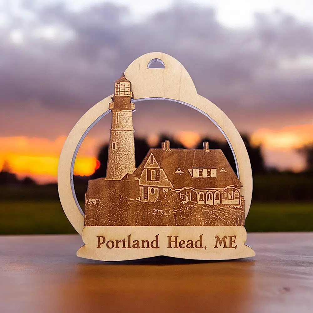 Looking for a Maine lighthouse souvenir? This Portland Head Lighthouse Ornament, crafted from pecan wood, is a timeless keepsake of Cape Elizabeth’s scenic coastline.