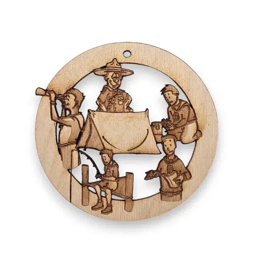 Honor the spirit of outdoor adventure and leadership with this handcrafted Scouting ornament, made from natural wood.