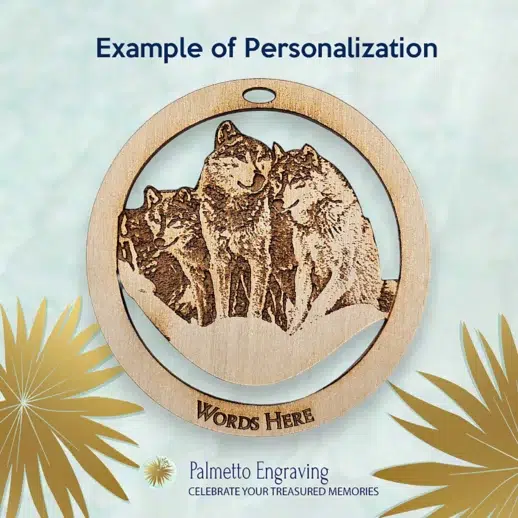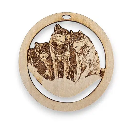 A beautifully engraved wolf pack ornament, handcrafted and customized for wildlife lovers.